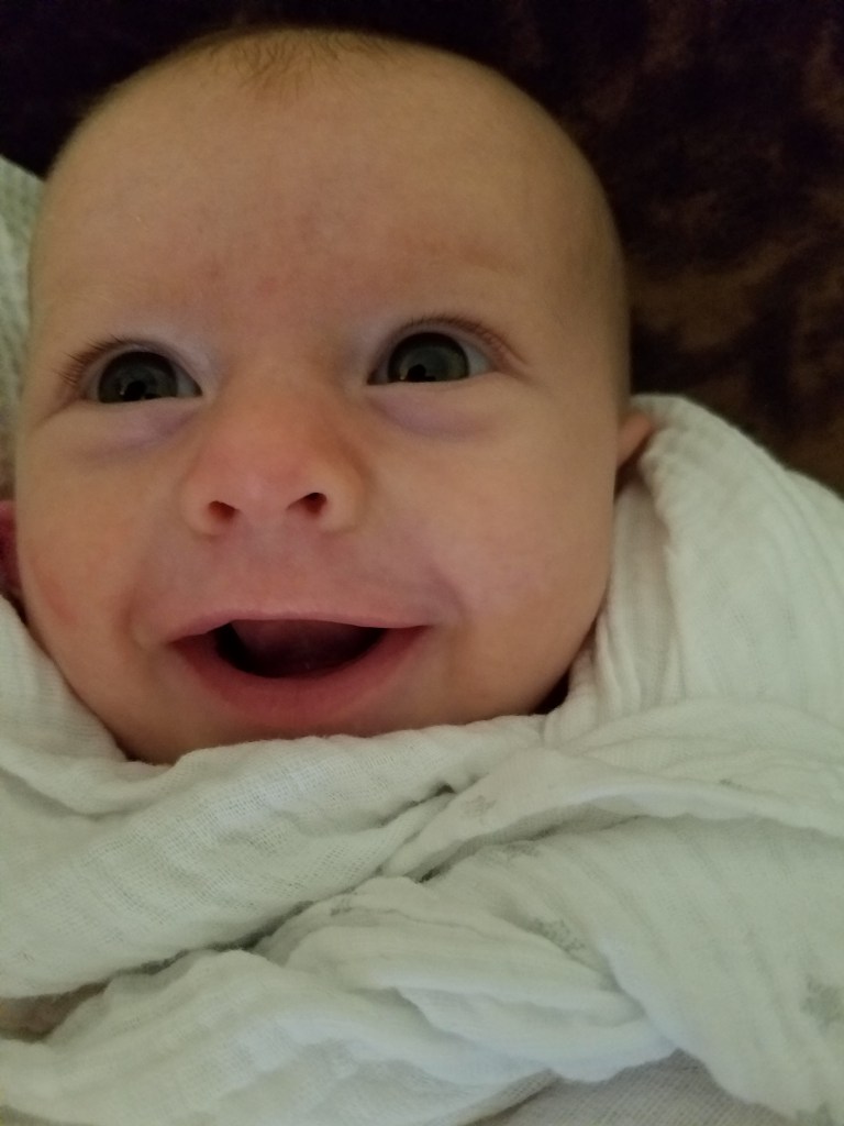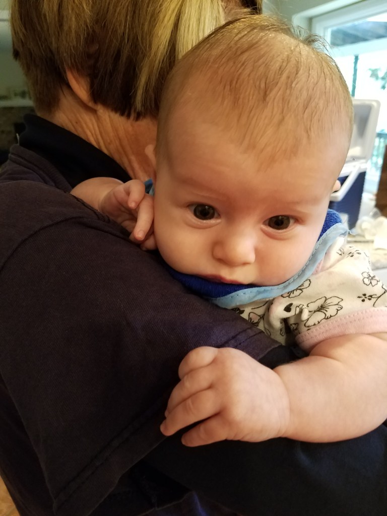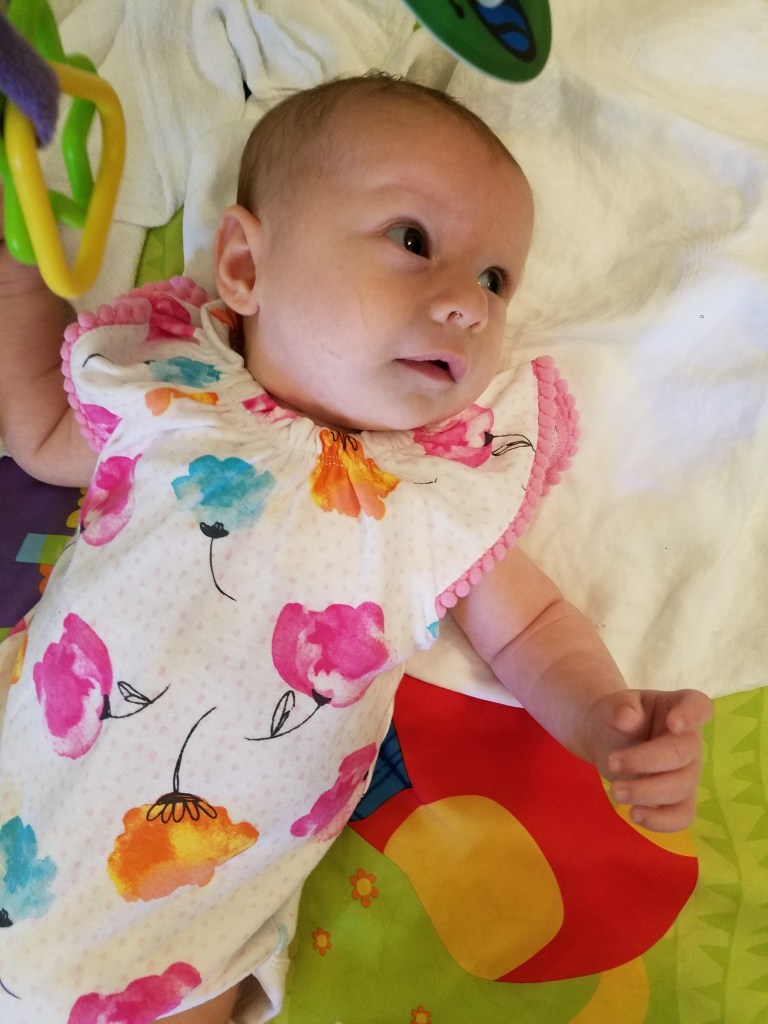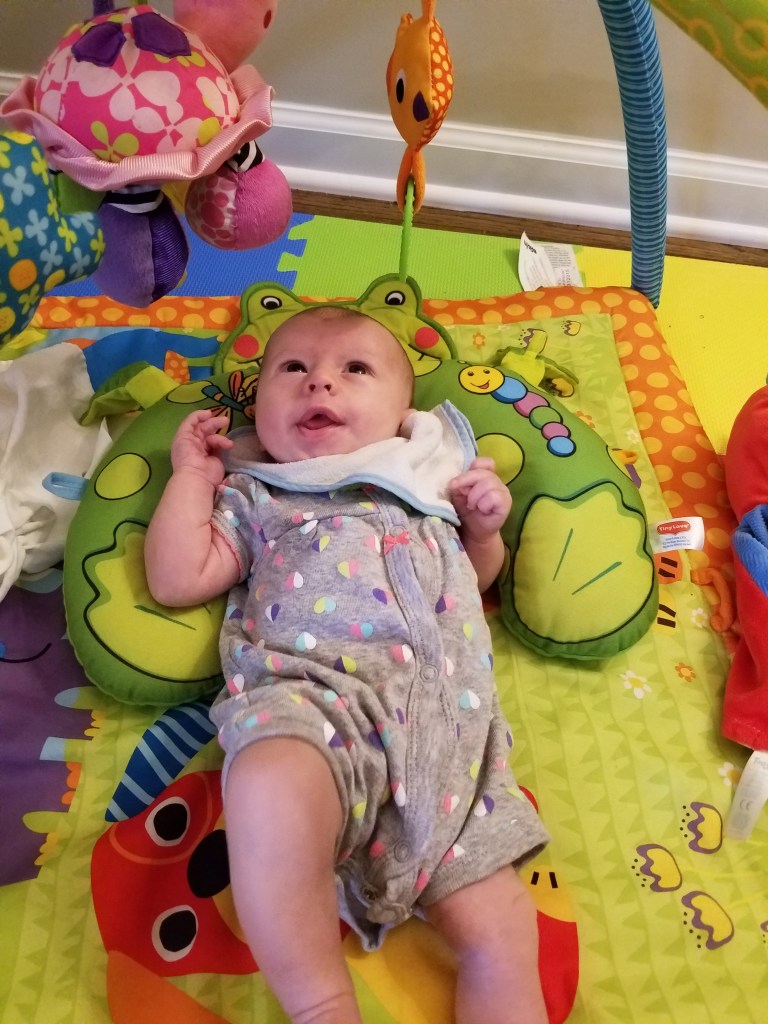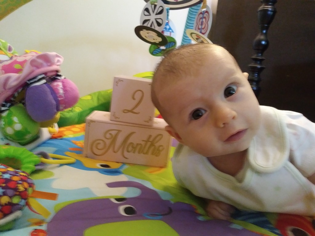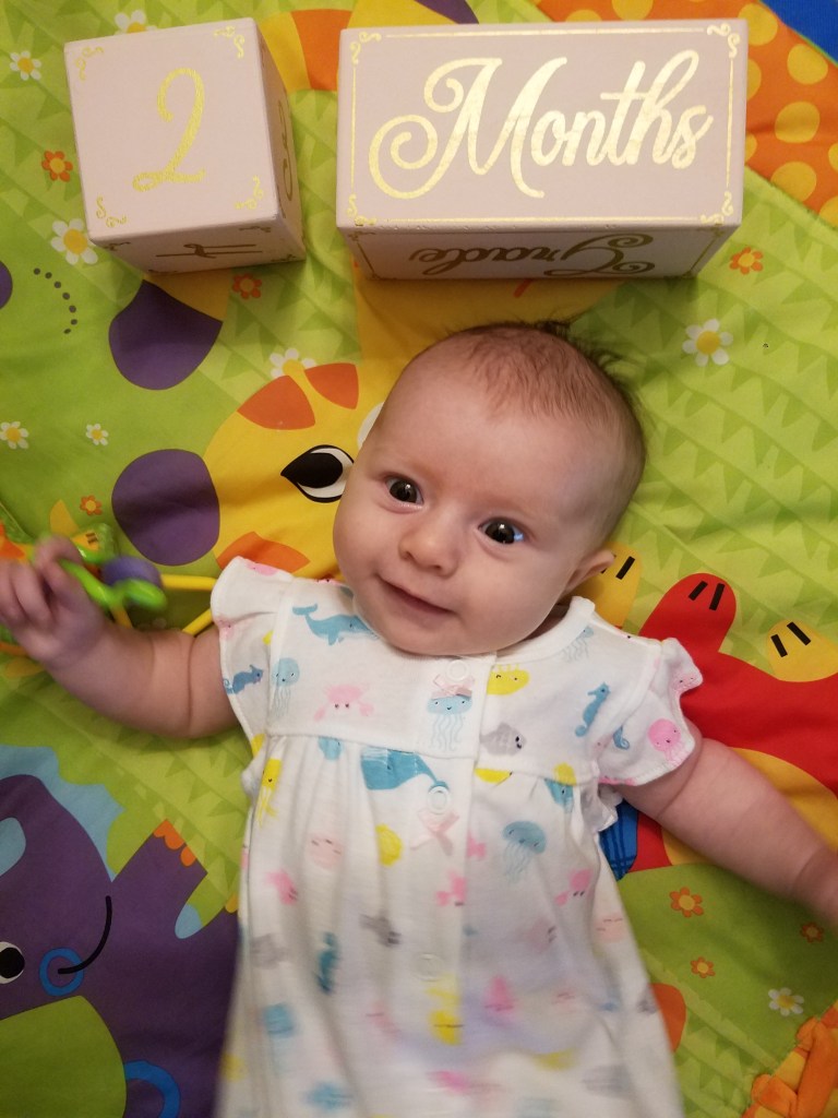 Jane turns two months! Some big milestones this month are first smiles and holding her head up. She loves kicking and looking around, especially at other babies. Also this month we had more visits with Cici, Grandma Kathy, Aunt Liz, and Aunt Kaitlin.